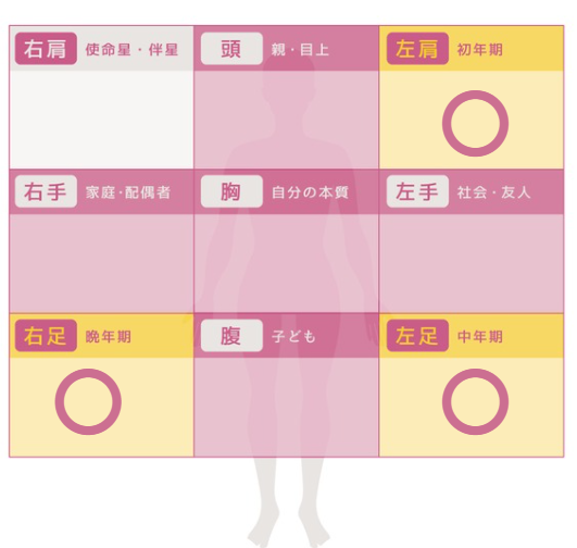 天印星が人体図のどこにあるかで、その性質が現れる人生の時期が変わります。